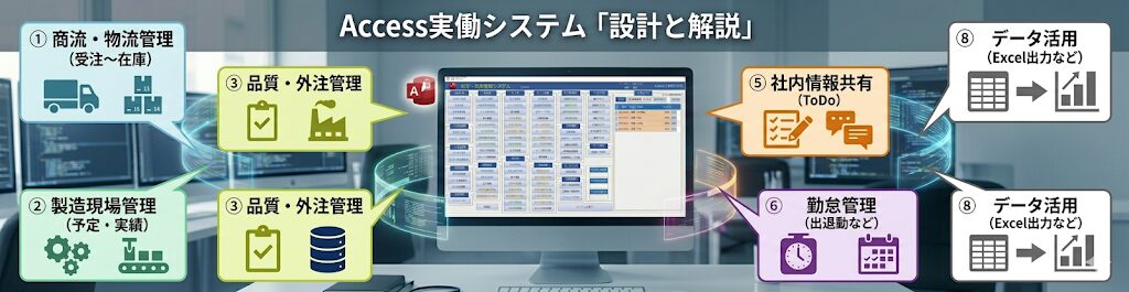 当サイトでは、一般的なAccessの教本にあるような基礎的な操作手順はあえて割愛しています。重視しているのは、実務において最も重要な「誤操作・誤入力をいかに回避し、使い勝手の良いシステムを作るか」という設計の考え方と、地味に便利な機能を実装した実働しているシステムを紹介しています。
