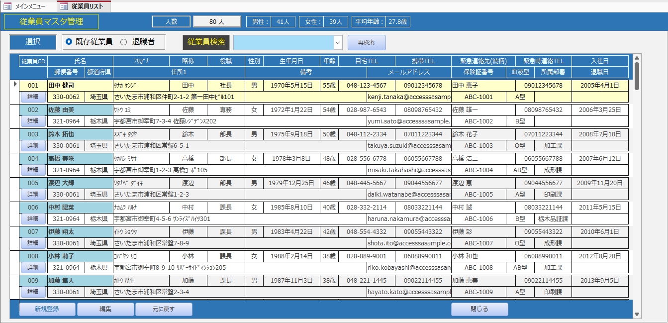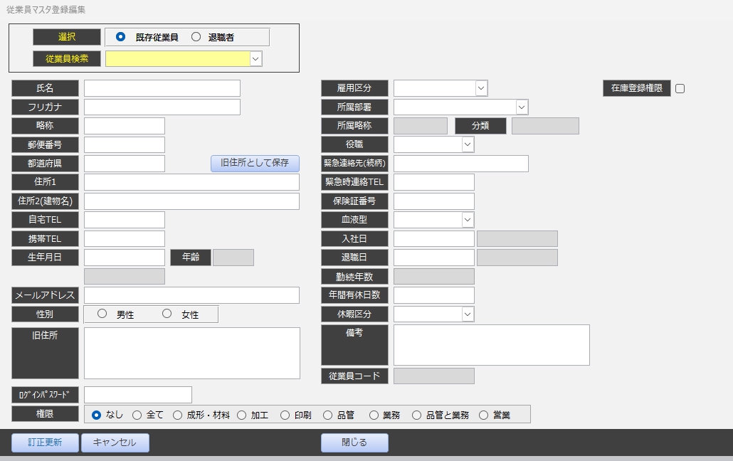 | F01従業員編集 | 登録されている従業員データを編集する単票フォーム | |