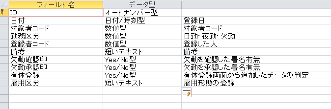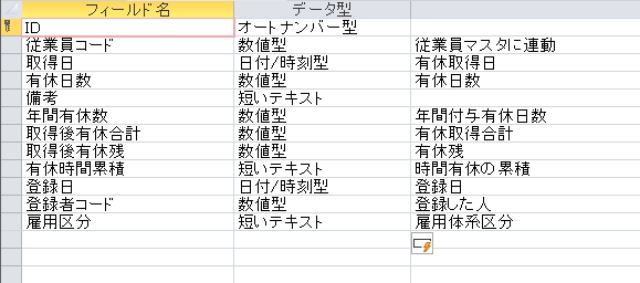 | 雇用区分 | 短いテキスト | 20 | オン | コンボボックス(値リスト) |