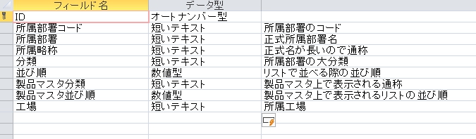| 所属部署 | 短いテキスト | 20 | オン | コンボボックス(値リスト) | |