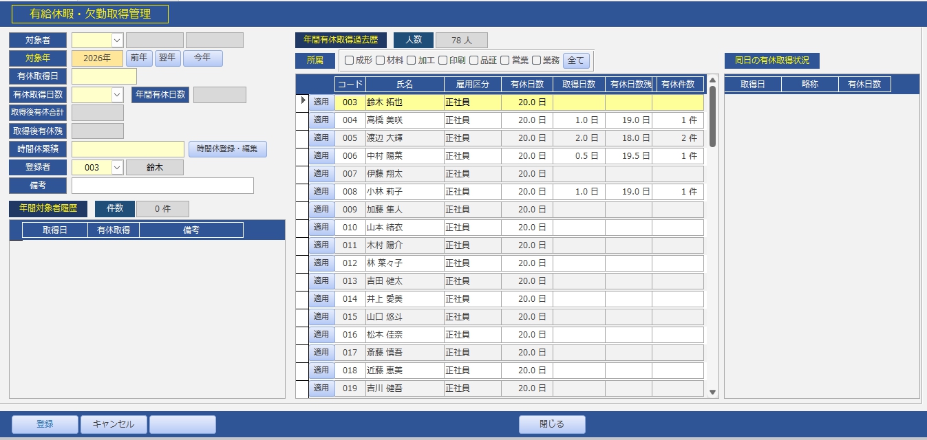 有休休暇の取得を管理するページ。対象者を呼び出して現状の有休取得状況を確認しながら登録します。