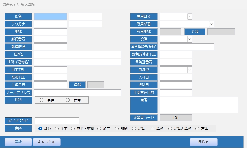 従業員リスト画面の下部に配置した 新規登録 ボタンから展開する新規登録画面です。