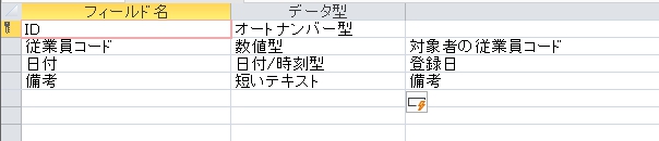 | 従業員コード | 短いテキスト | 5 | オフ | IDからテキスト型へ変更 | |