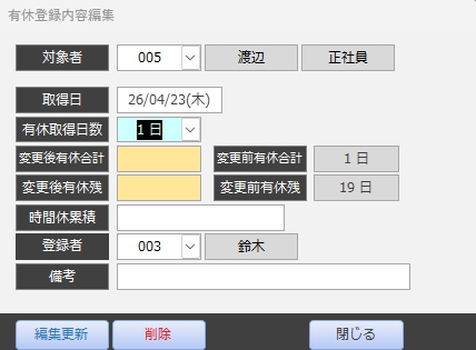 役割: 対象者の有休が取りやめになった場合などに登録データを編集します。